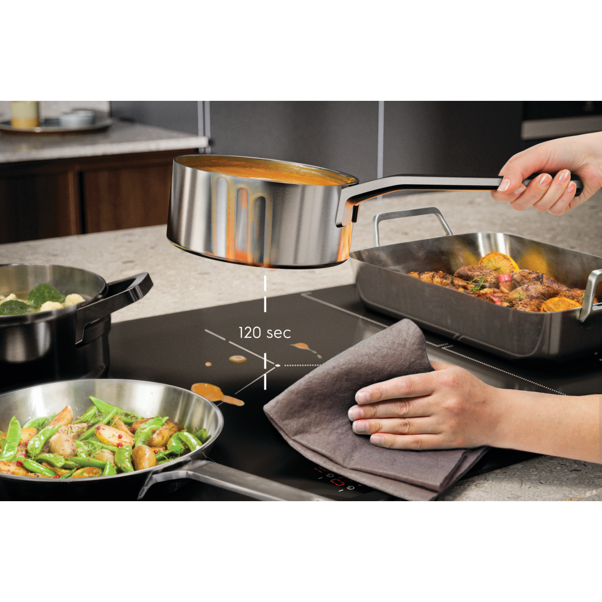 Induktsioonpliidiplaat 6000 Bridge saab hõlpsasti hakkama, kui valmistate toitu suuremate pannidega. Bridge-funktsioon ühendab kaks toiduvalmistusala, mis sobib mistahes suurele või pikale pannile. Ühendatud alal on samad temperatuuri- ja ajaseaded.
